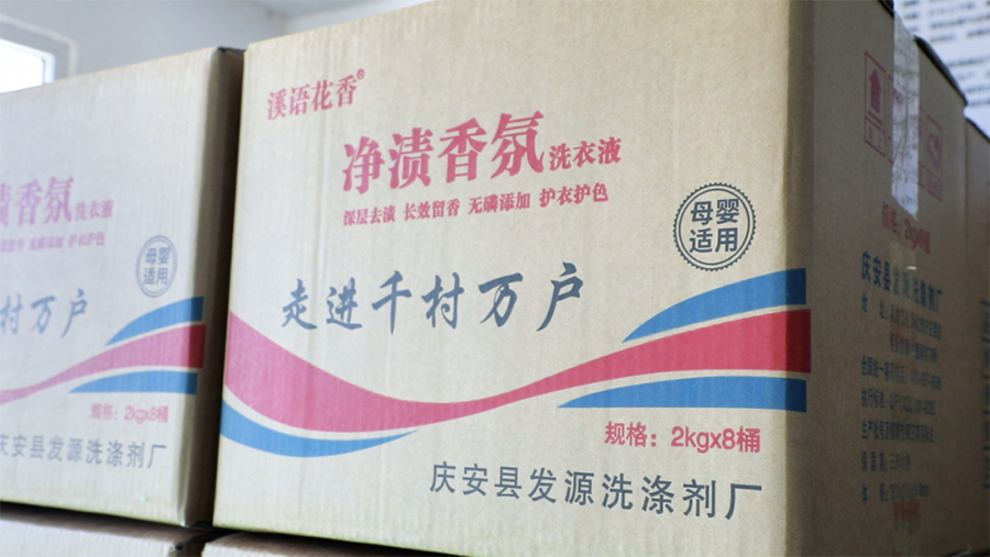 在发展乡发源村的村办洗涤剂厂内机器轰鸣,灌装、封口、贴标、装箱等工序有条不紊,一瓶瓶包装整洁的“溪语花香”洗衣液陆续下线,即将发往周边乡镇及县城商超。