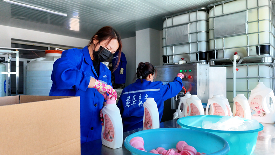 发源洗涤剂厂工人马文静(在家门口的工厂上班,每个月能挣四千多,还能照顾老人孩子,比外出打工踏实多了。)