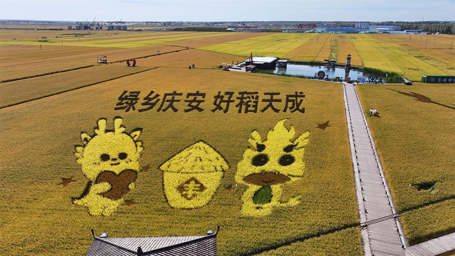 游客踏上木板栈道漫步,微风轻拂,卷起层层稻浪,空气中弥漫着浓浓的稻香,沁人心脾,“忘情绿乡山水,心醉庆安稻香”。小朋友们喜爱的卡通稻草泥塑充满了童真童趣。登上观光塔,极目远眺,绿色、生态的自然美景尽收眼底,游客们纷纷驻足同“绿乡庆安 好稻天成”巨幅稻田画拍照留念。