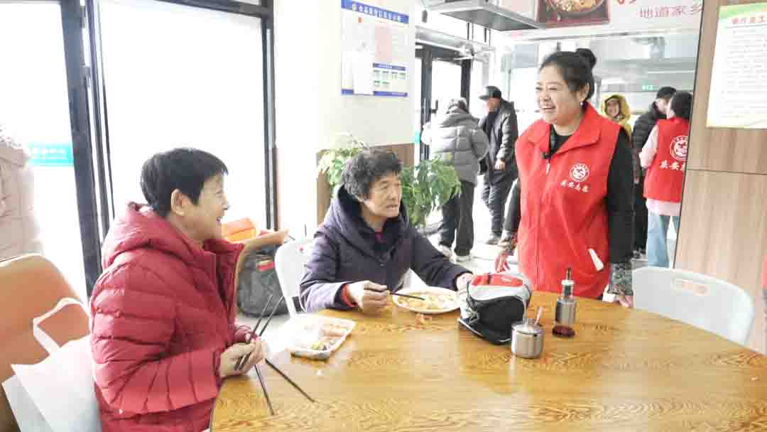 热闹的餐厅里,身着红马甲的志愿者步履不停。门口有人迎,桌前有人帮,这边刚扶老人落座,那边已俯身收拾碗筷。人声鼎沸中,那一抹抹红色穿梭往来,时隐时现,像一团团流动的火苗,把餐厅烘得暖意融融。