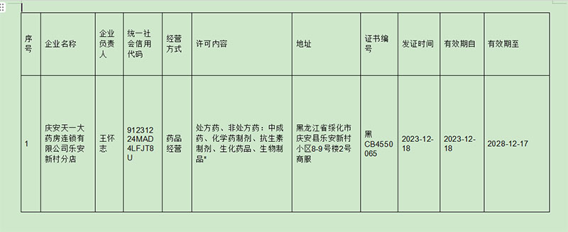 根据《药品管理法》《药品经营许可证管理办法》规定,我局依据《黑龙江省药品零售企业开办验收标准(试行)》《药品经营质量管理规范》组织现场检查,以下市场主体符合《药品经营许可证管理办法》规定的内容,发放药品经营许可证。现予以公示,请社会各界予以监督。