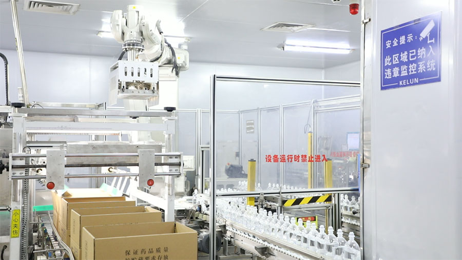 在博宇制药生产车间,物料经过浓配、稀配、灌装、灭菌、灯检、包装等步骤,完成整个生产过程的大容量注射液从自动化生产线上进入库房待检,待检验报告单下发后将发往省内外。